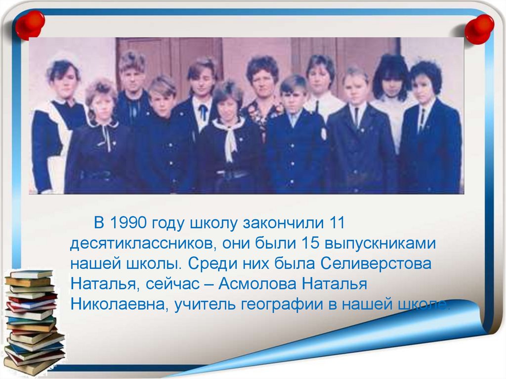 В 1990 году школу закончили 11десятиклассников, они были 15 выпускниками