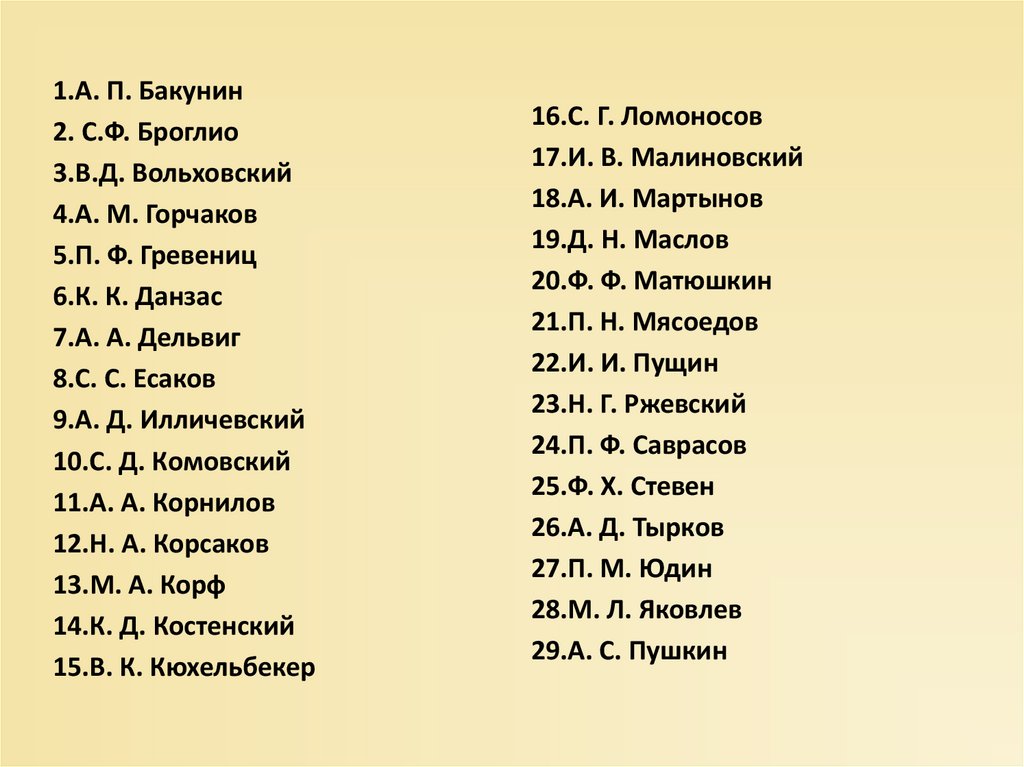 1.А. П. Бакунин2. С.Ф. Броглио