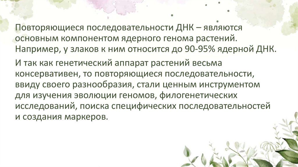 Повторяющиеся последовательности ДНК – являютсяосновным компонентом ядерного генома растений.
