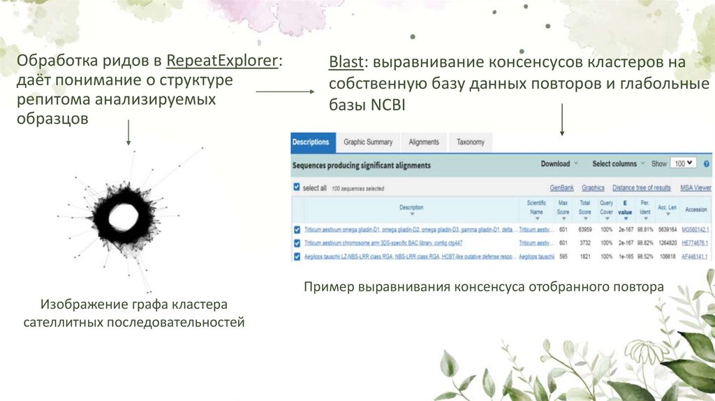 1. В результате биоинформатического анализа с помощью пайплайнаRepeatExplorer сиквенсов 4 образцов Aegilops tauschii и 1 образца Aegilops