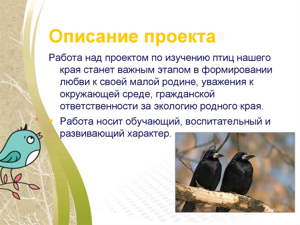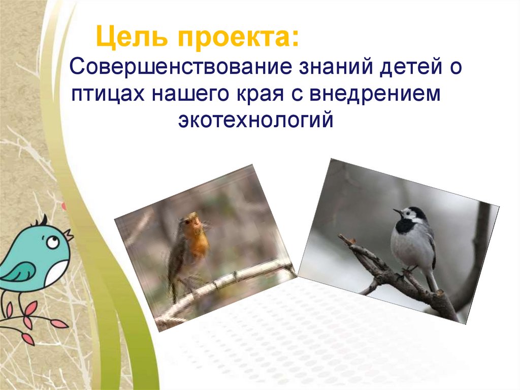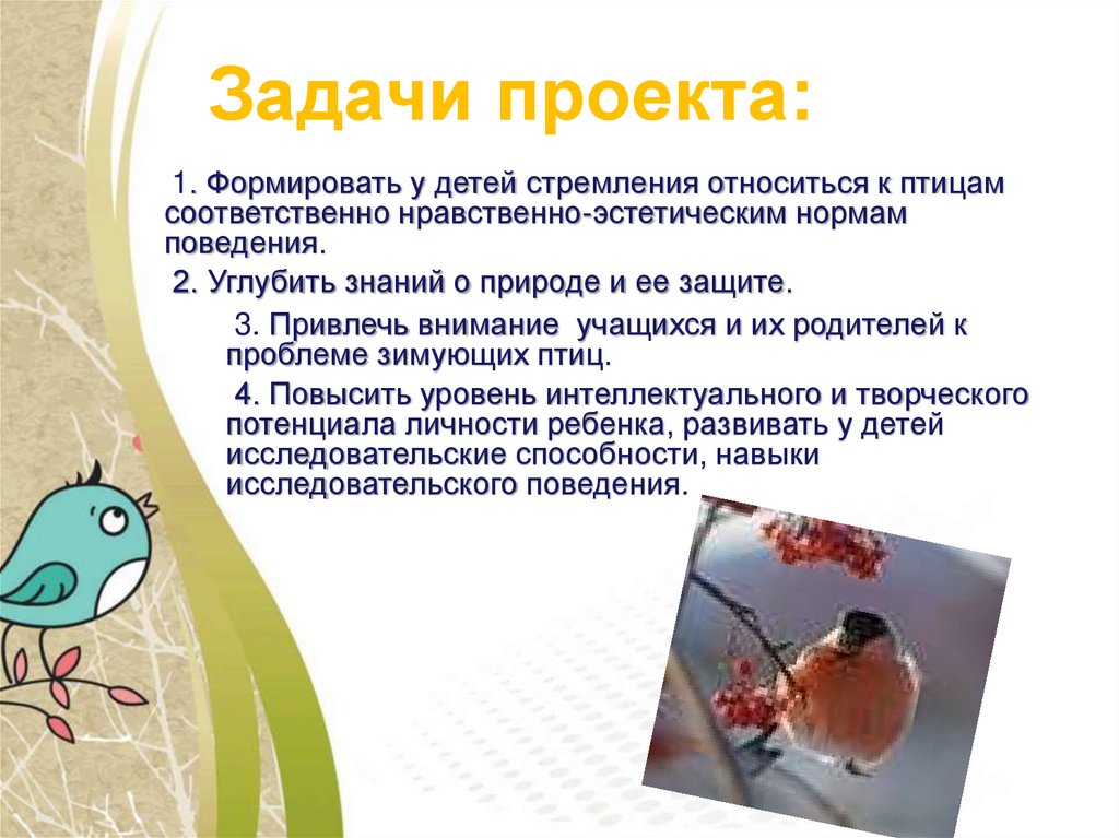 Задачи проекта:1. Формировать у детей стремления относиться к птицам