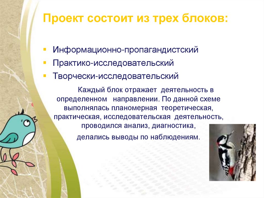 Проект состоит из трех блоков:Информационно-пропагандистский