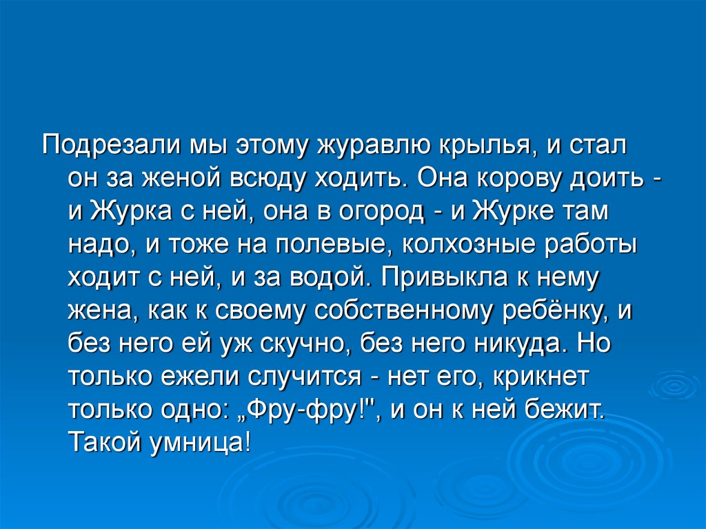 Подрезали мы этому журавлю крылья, и сталон за женой всюду ходить. Она корову доить и Журка с ней, она в огород - и Журке там