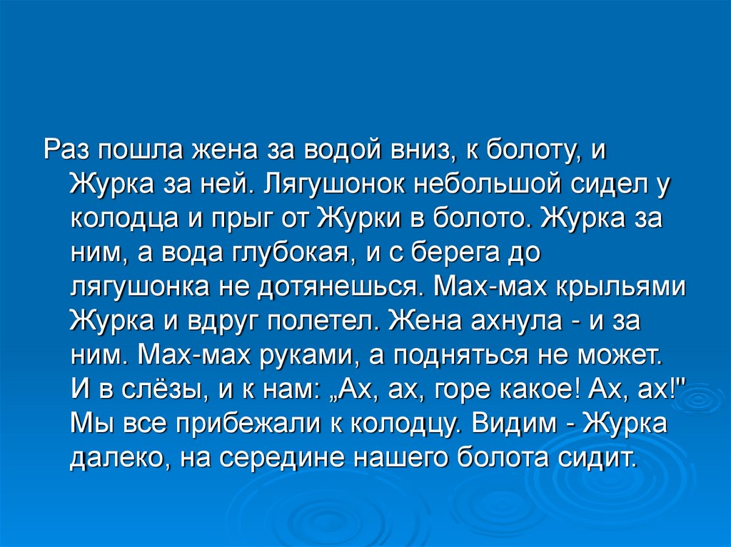 Раз пошла жена за водой вниз, к болоту, иЖурка за ней. Лягушонок небольшой сидел у