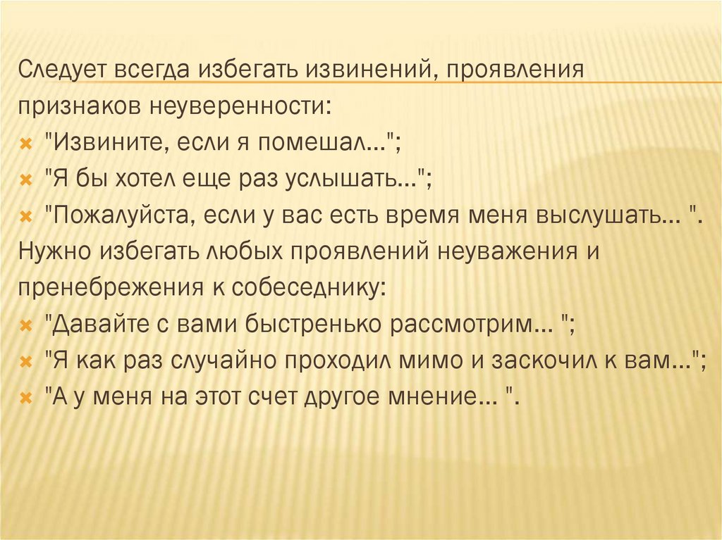 Следует всегда избегать извинений, проявленияпризнаков неуверенности: