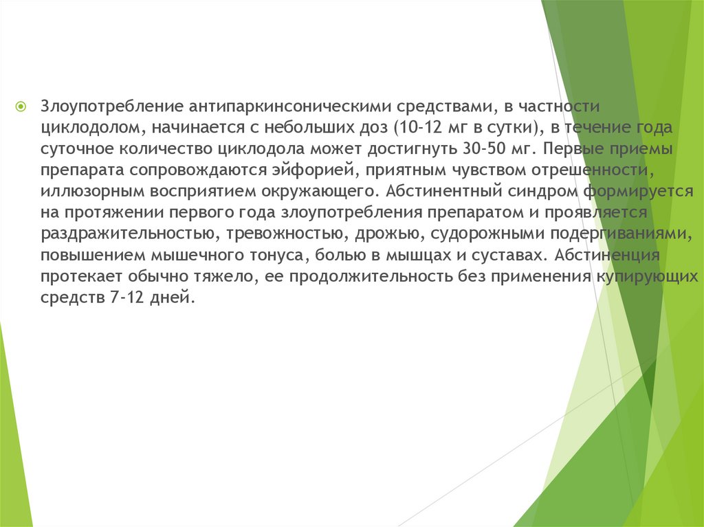 Злоупотребление антипаркинсоническими средствами, в частностициклодолом, начинается с небольших доз (10-12 мг в сутки), в течение года