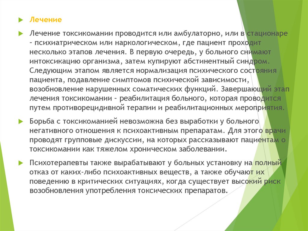 ЛечениеЛечение токсикомании проводится или амбулаторно, или в стационаре