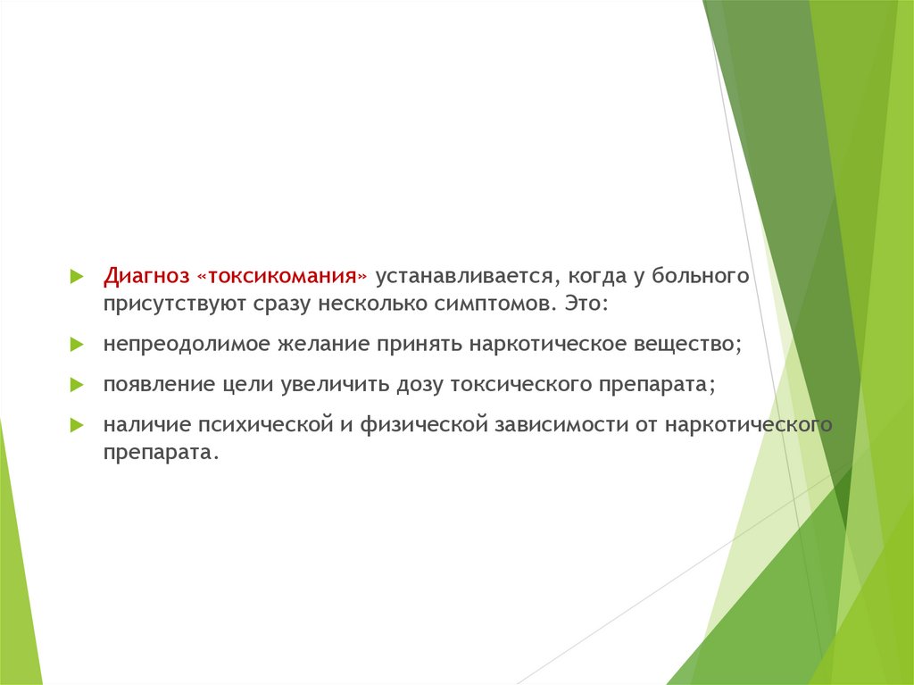 Диагноз «токсикомания» устанавливается, когда у больногоприсутствуют сразу несколько симптомов. Это: