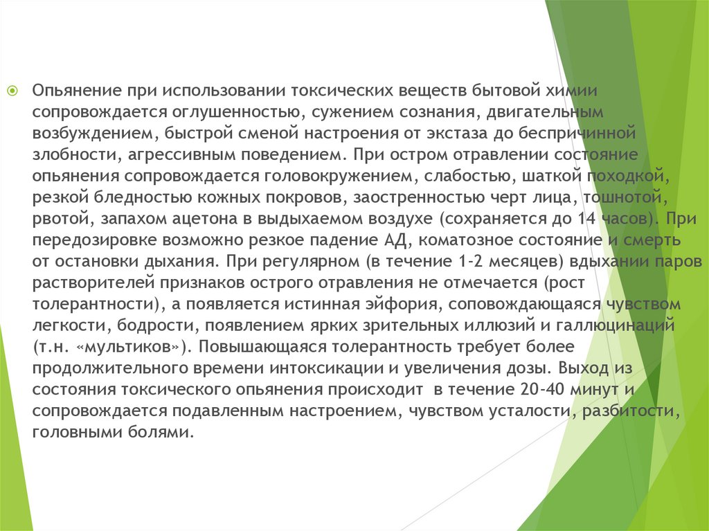Опьянение при использовании токсических веществ бытовой химиисопровождается оглушенностью, сужением сознания, двигательным
