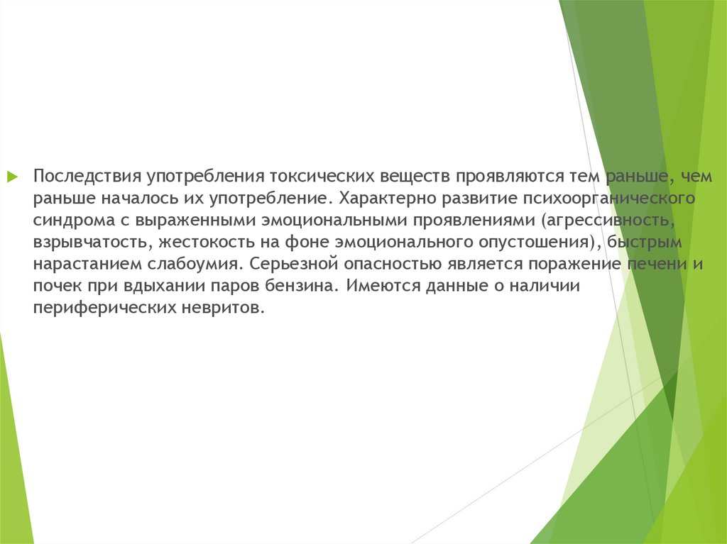Последствия употребления токсических веществ проявляются тем раньше, чемраньше началось их употребление. Характерно развитие психоорганического