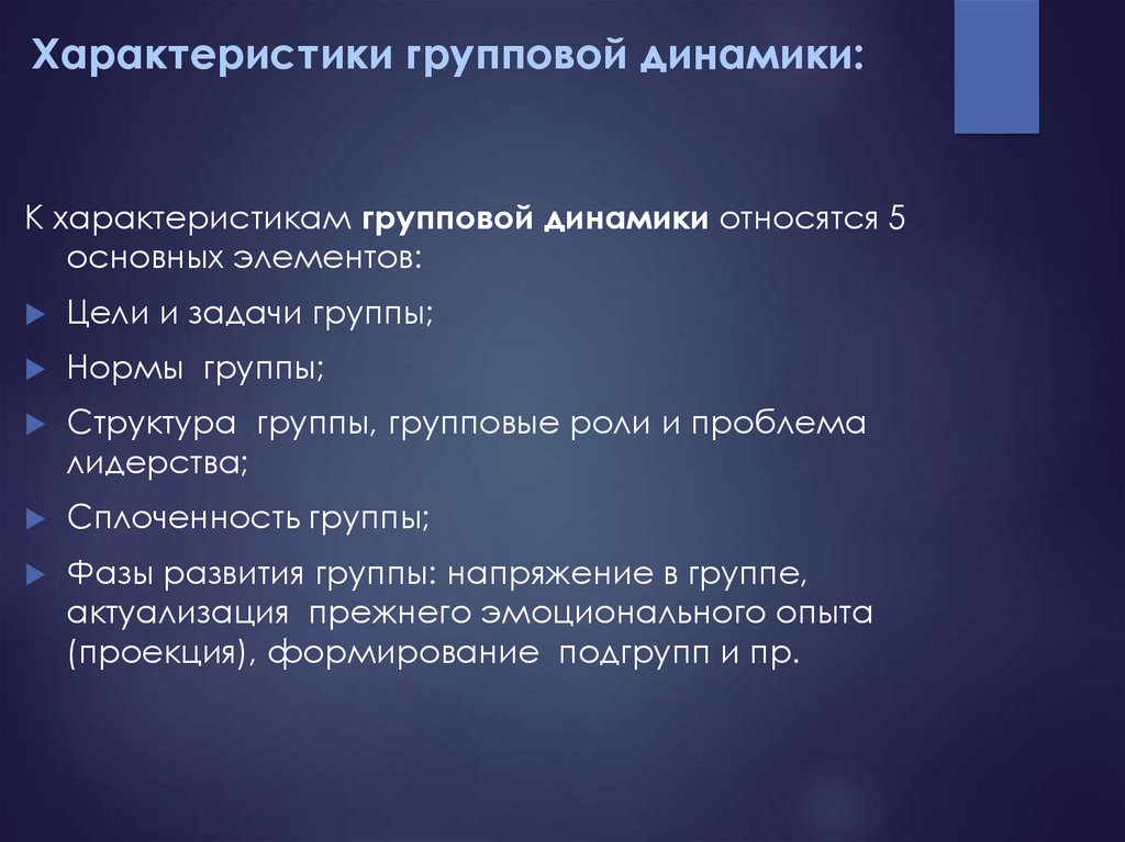 Характеристики групповой динамики:К характеристикам групповой динамики относятся 5