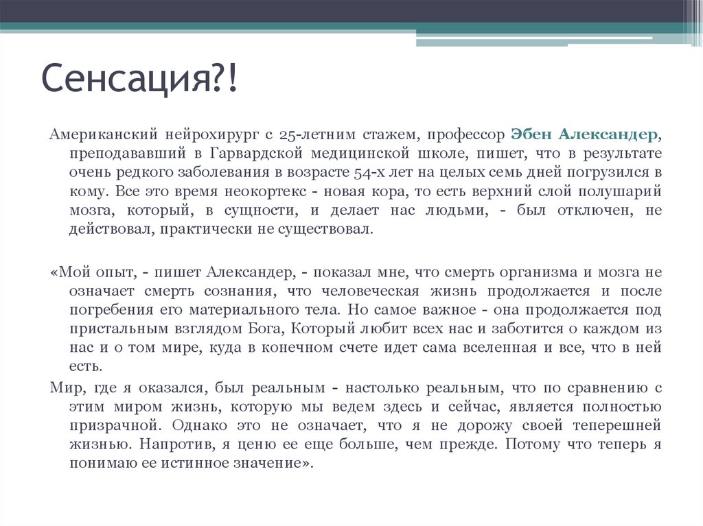 Американский нейрохирург с 25-летним стажем, профессор Эбен Александер,преподававший в Гарвардской медицинской школе, пишет, что в результате