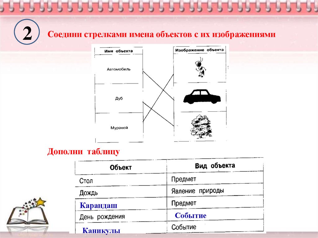 2Соедини стрелками имена объектов с их изображениями