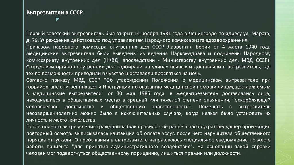 Согласно приказу МВД СССР "Об утверждении Положения о медицинском вытрезвителе при