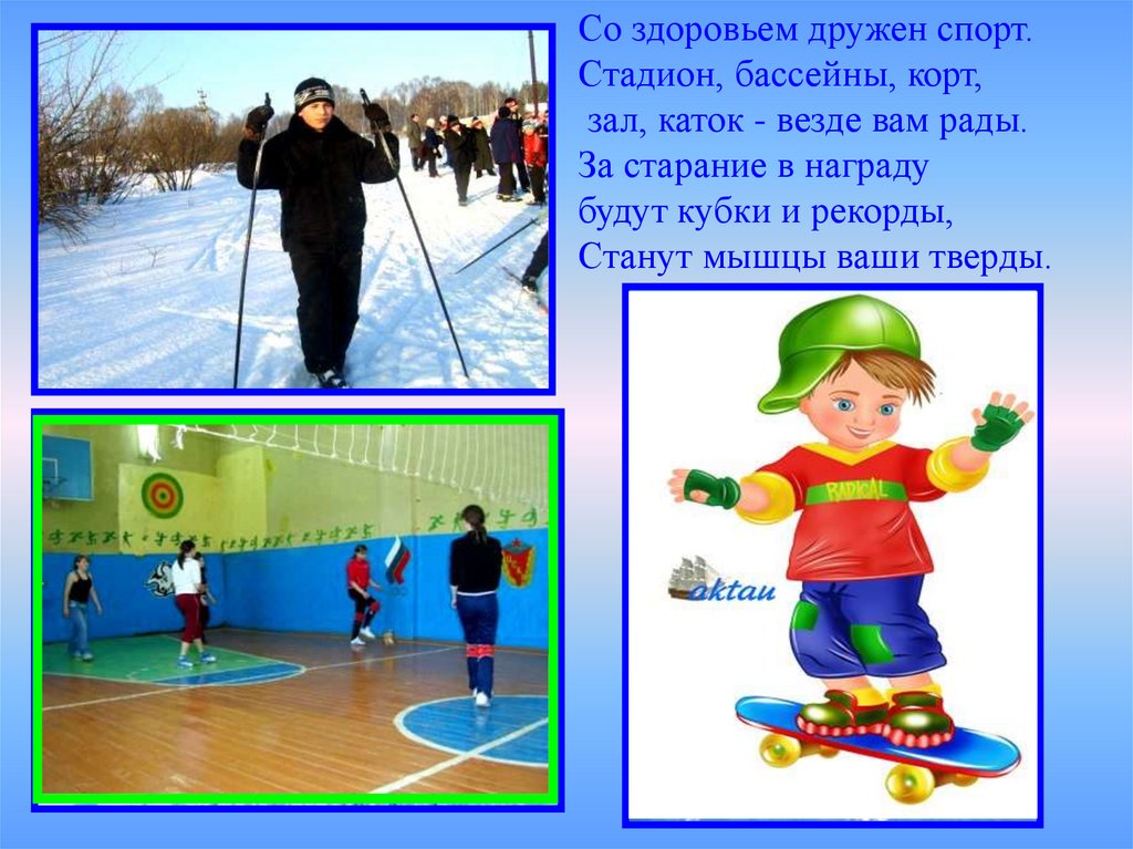 Со здоровьем дружен спорт.Стадион, бассейны, корт,