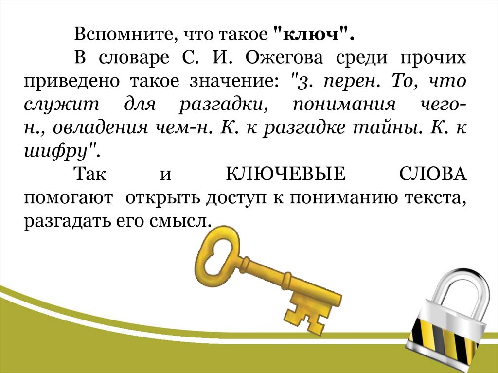 Вспомните, что такое "ключ".В словаре С. И. Ожегова среди прочих