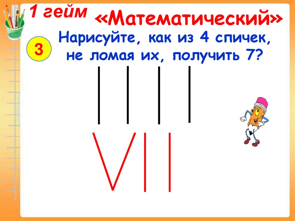 1 гейм «Математический»Нарисуйте, как из 4 спичек,