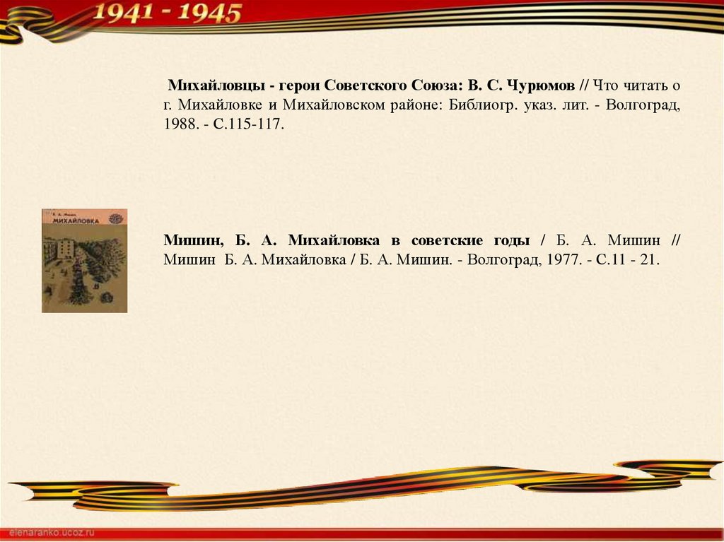 Мишин Б. А. Михайловка / Б. А. Мишин. - Волгоград, 1977. - С.11 - 21.