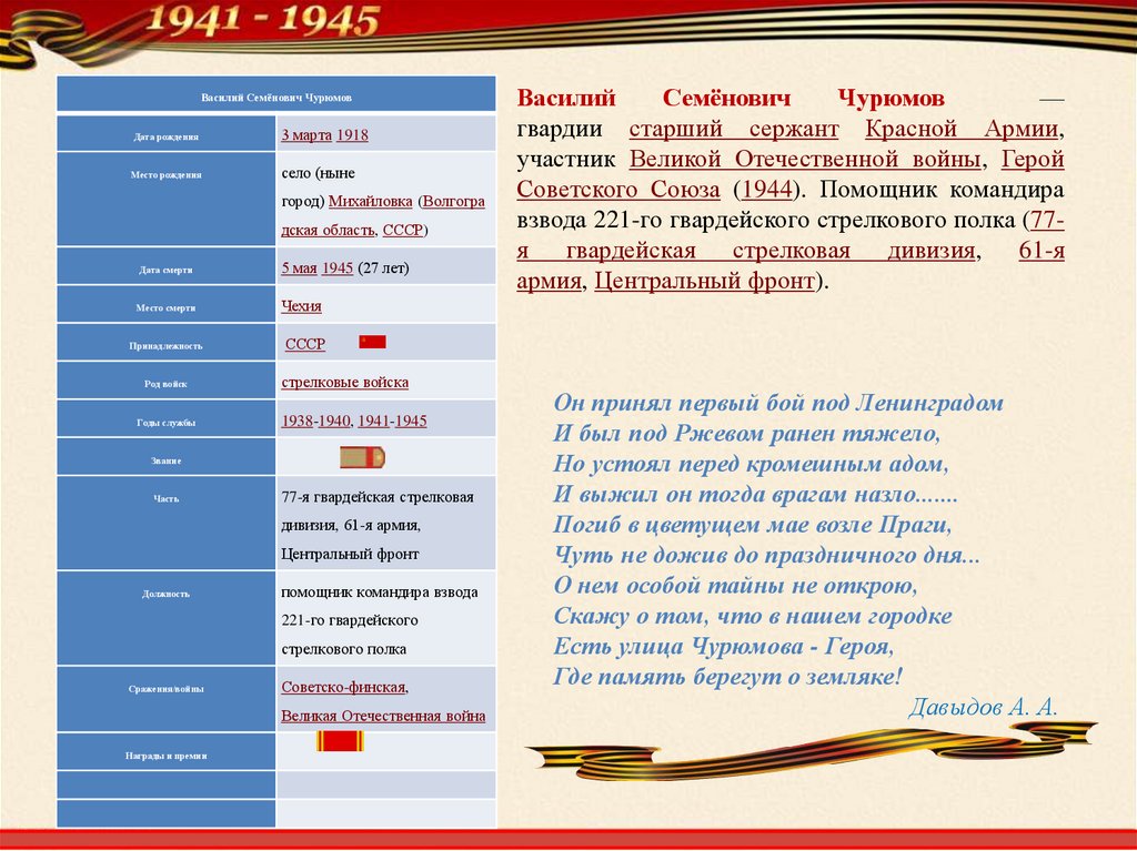 Давыдов, А. А. Земляку, Герою Советского Союза Чурюмову Василию