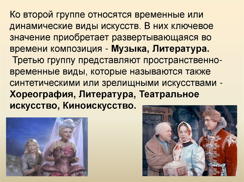 Ко второй группе относятся временные илидинамические виды искусств. В них ключевое