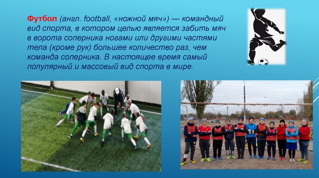 Футбол (англ. football, «ножной мяч») — командныйвид спорта, в котором целью является забить мяч