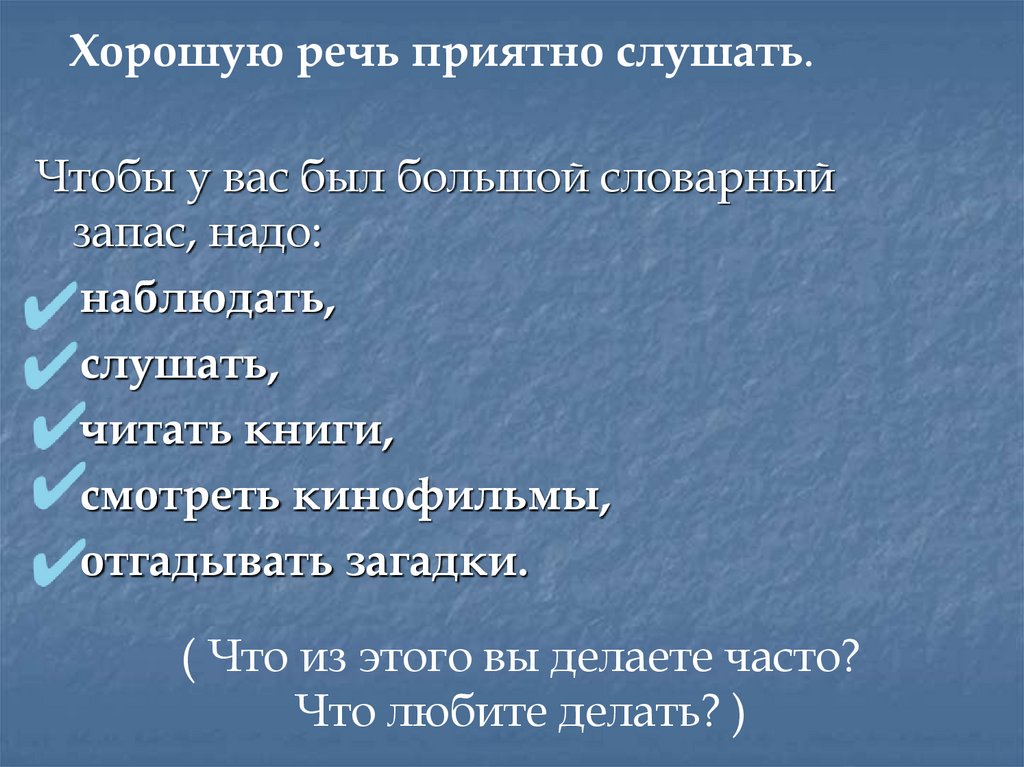 Хорошую речь приятно слушать.Чтобы у вас был большой словарный