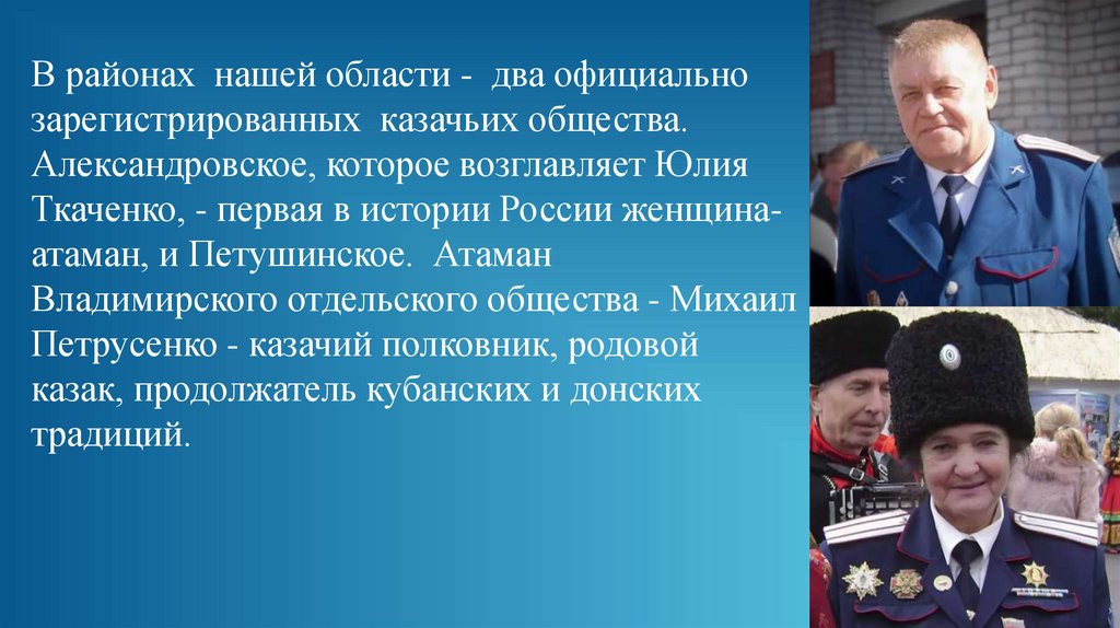 Ткаченко, - первая в истории России женщинаатаман, и Петушинское. Атаман