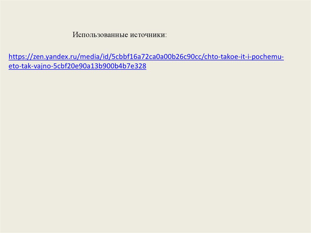 Использованные источники:https://zen.yandex.ru/media/id/5cbbf16a72ca0a00b26c90cc/chto-takoe-it-i-pochemueto-tak-vajno-5cbf20e90a13b900b4b7e328