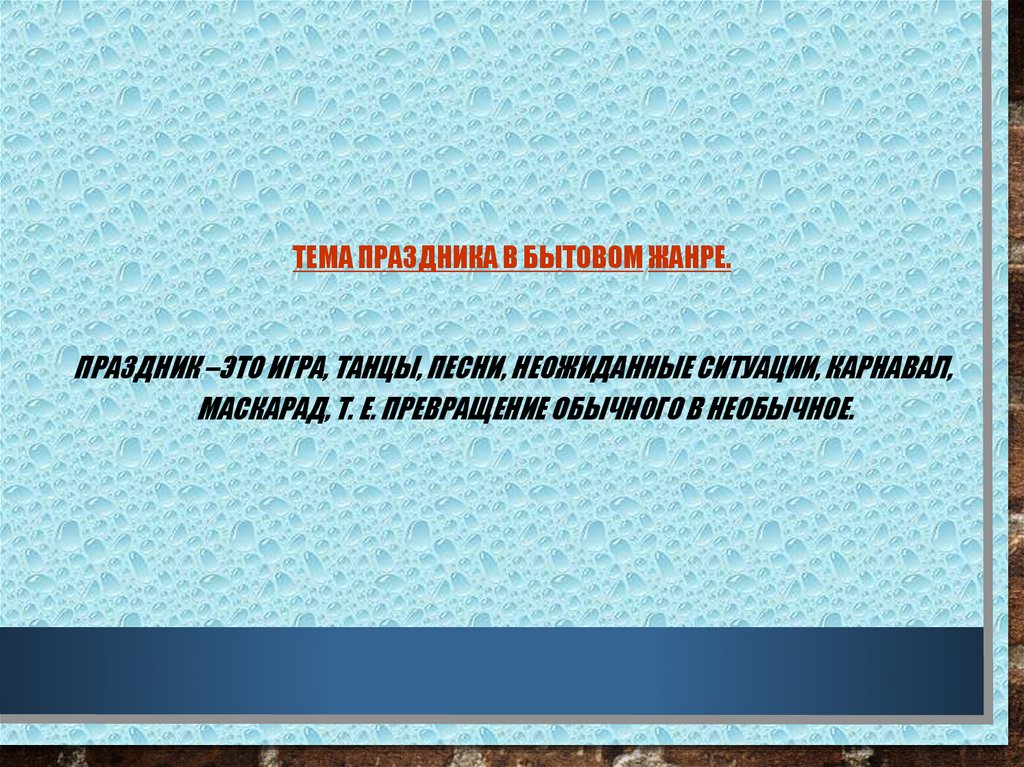 ТЕМА ПРАЗДНИКА В БЫТОВОМ ЖАНРЕ.ПРАЗДНИК –ЭТО ИГРА, ТАНЦЫ, ПЕСНИ, НЕОЖИДАННЫЕ СИТУАЦИИ, КАРНАВАЛ,
