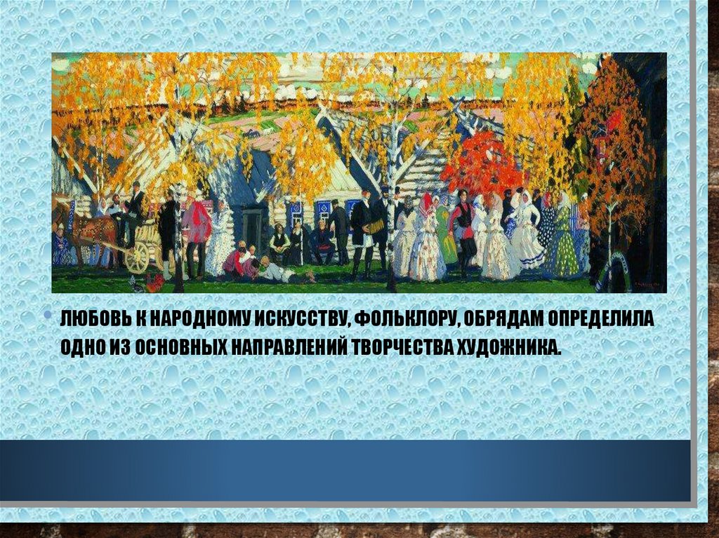 • ЛЮБОВЬ К НАРОДНОМУ ИСКУССТВУ, ФОЛЬКЛОРУ, ОБРЯДАМ ОПРЕДЕЛИЛАОДНО ИЗ ОСНОВНЫХ НАПРАВЛЕНИЙ ТВОРЧЕСТВА ХУДОЖНИКА.