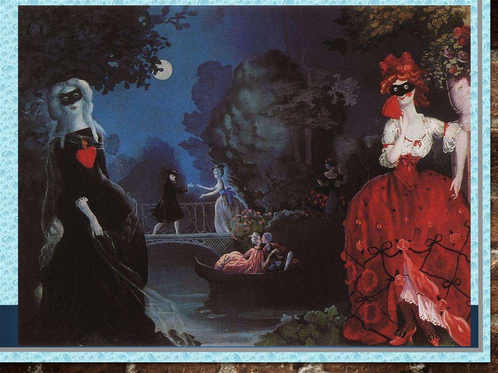 В ПРОИЗВЕДЕНИЯХ ХУДОЖНИКА ЧАСТО МОЖНО УВИДЕТЬКАРНАВАЛЬНО- ИГРИВЫЕ СЦЕНЫ С ДЕЙСТВУЮЩИМИ