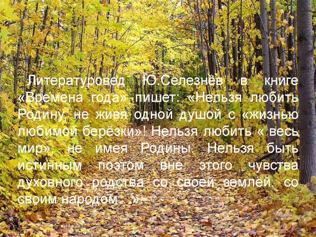 Литературовед Ю.Селезнёв в книге«Времена года» пишет: «Нельзя любить