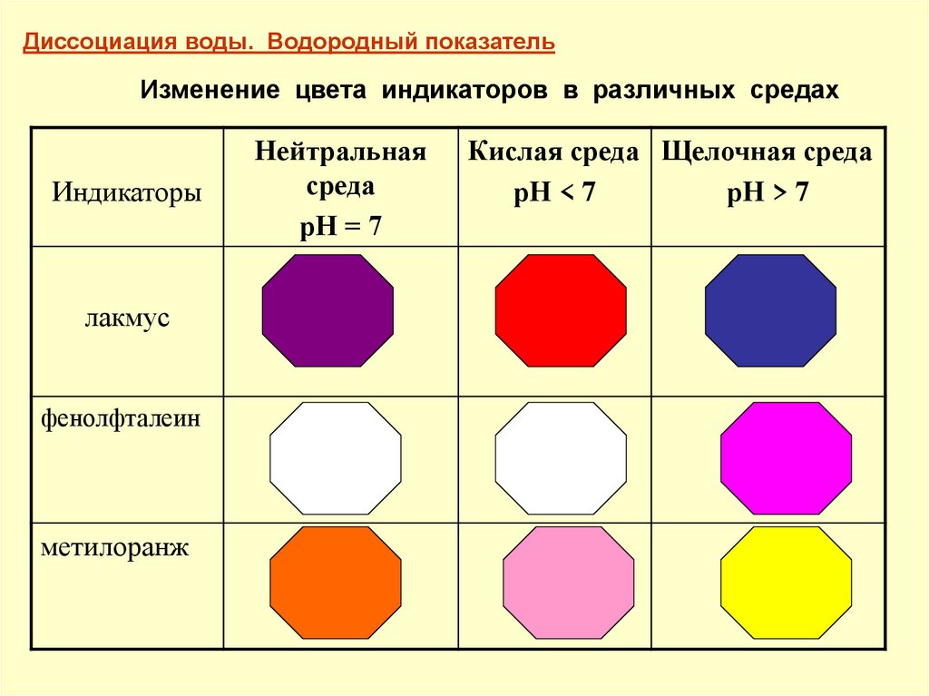 Диссоциация воды. Водородный показательИзменение цвета индикаторов в различных средах