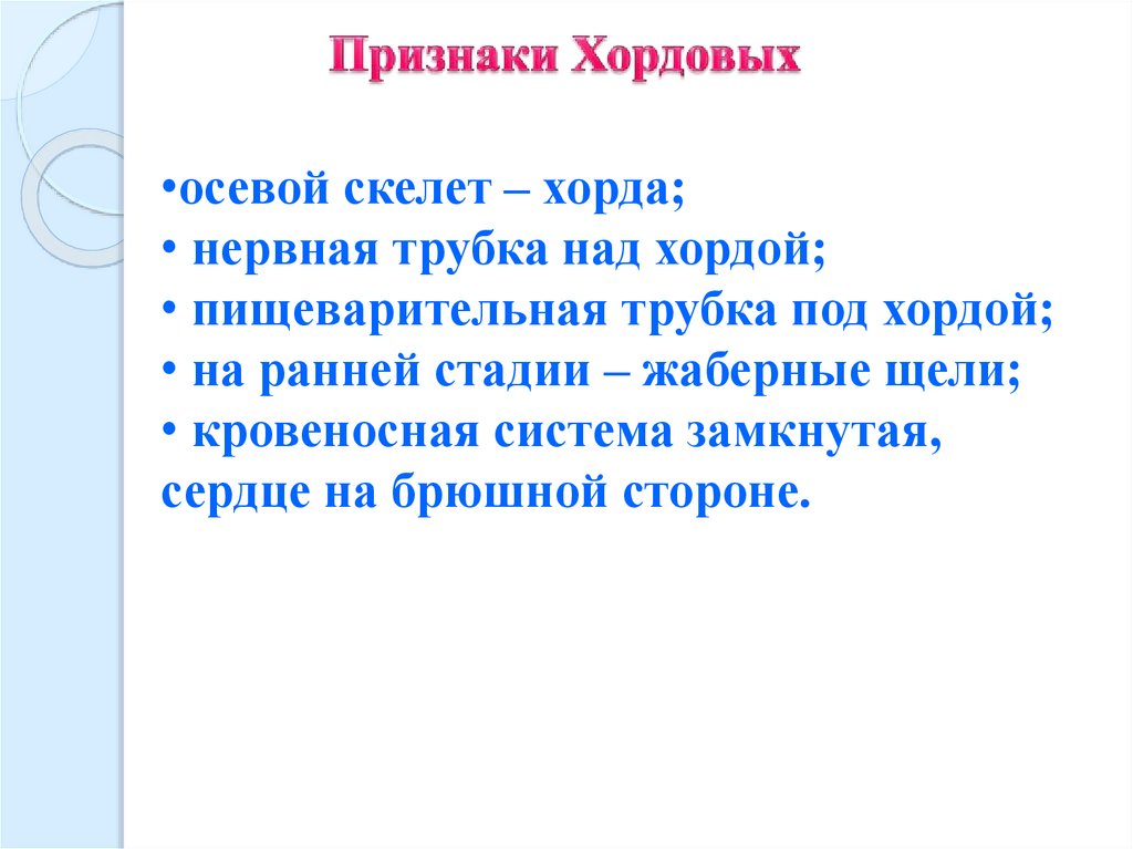 •осевой скелет – хорда;• нервная трубка над хордой;