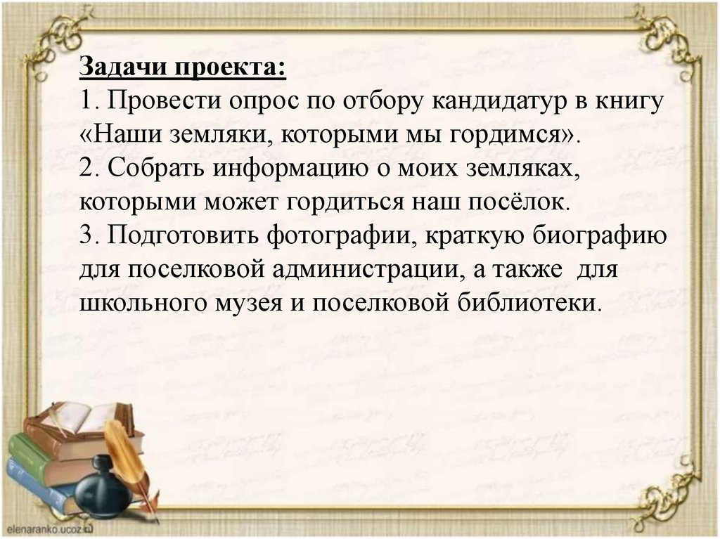 Задачи проекта:1. Провести опрос по отбору кандидатур в книгу