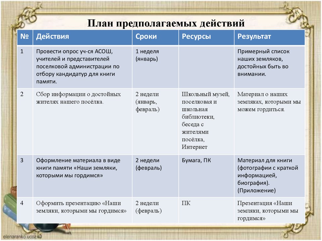 План предполагаемых действий№ Действия