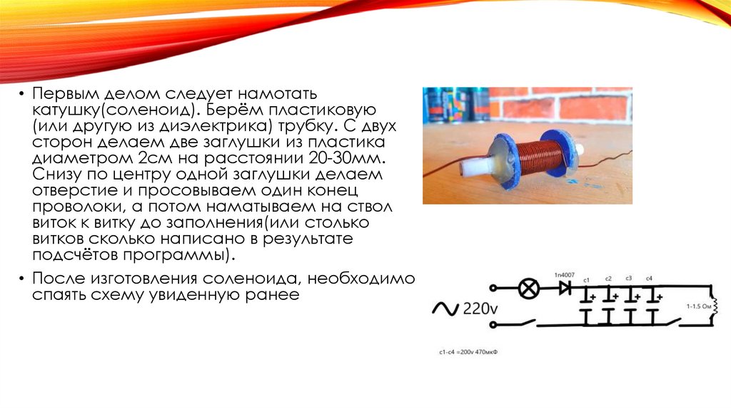 • Первым делом следует намотатькатушку(соленоид). Берём пластиковую