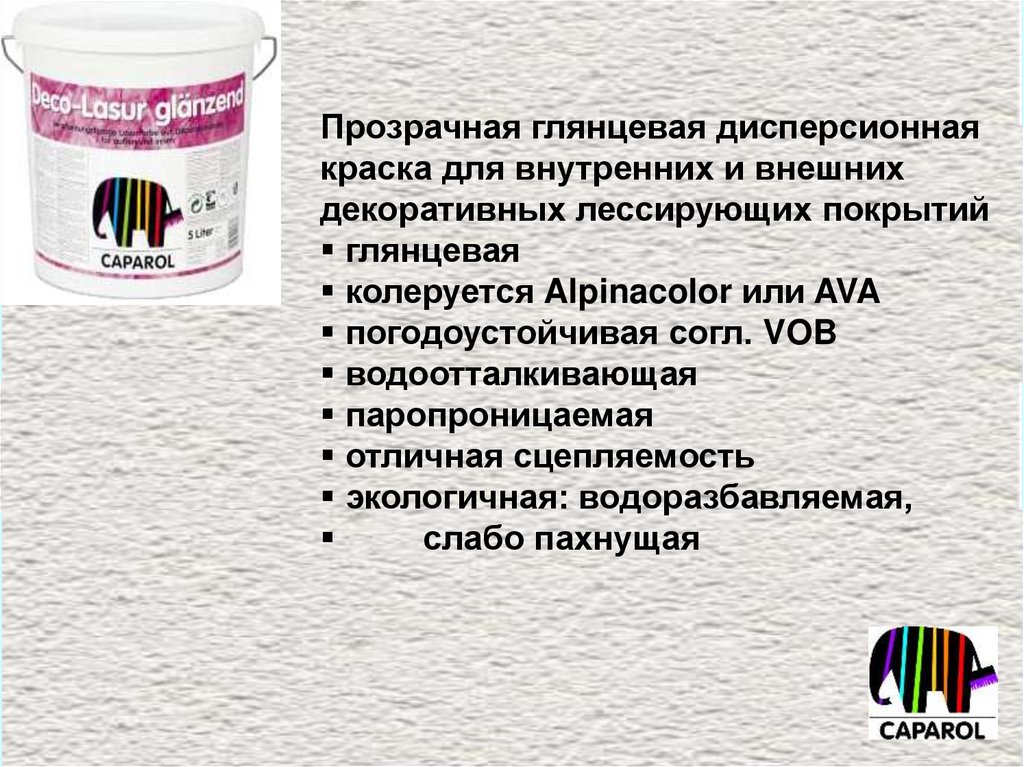 Прозрачная глянцевая дисперсионнаякраска для внутренних и внешних