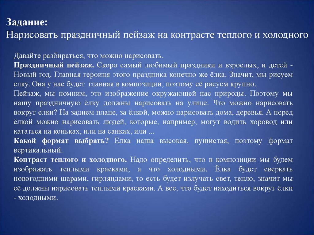 Задание:Нарисовать праздничный пейзаж на контрасте теплого и холодного
