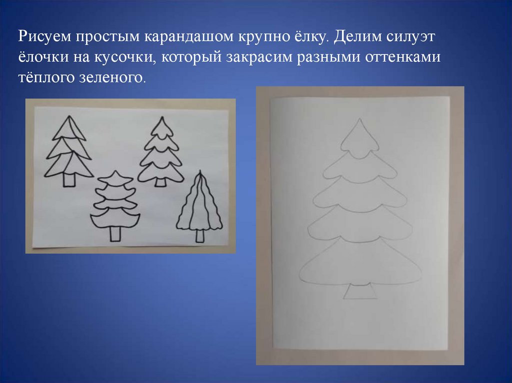 Рисуем простым карандашом крупно ёлку. Делим силуэтёлочки на кусочки, который закрасим разными оттенками