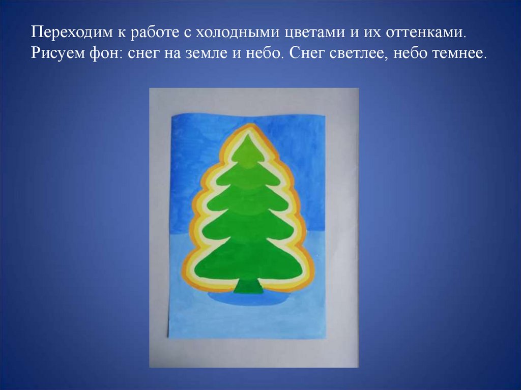 её должны нарисовать теплыми красками. А все, что будет находиться вокруг ёлки
