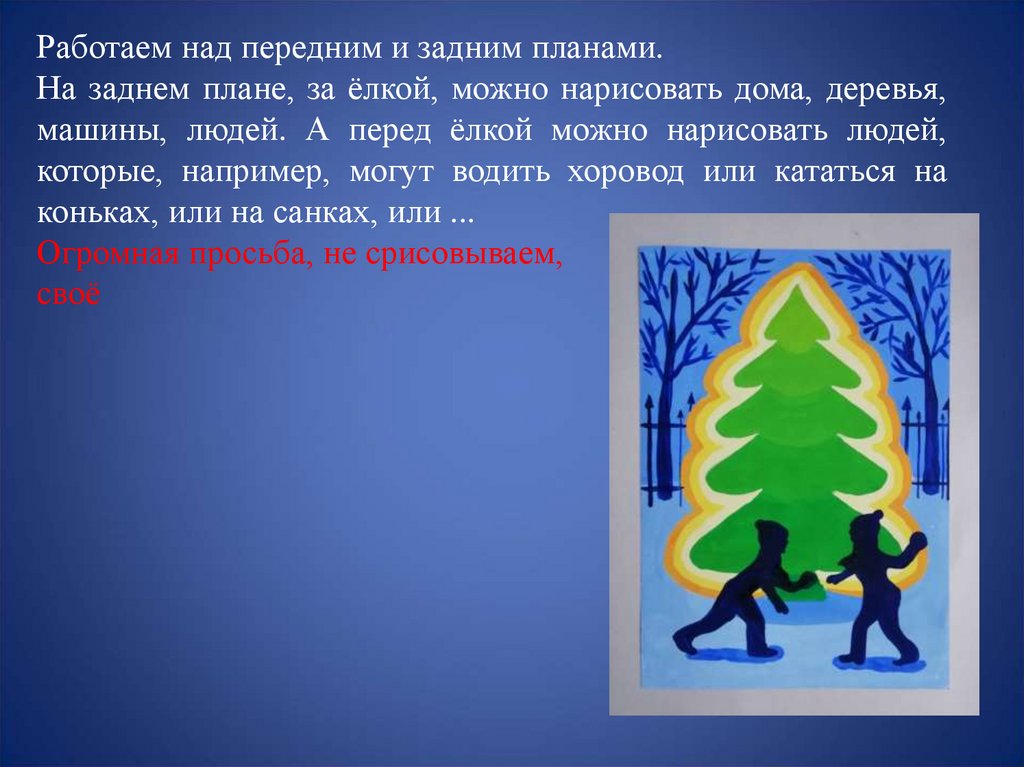 вокруг елки? На заднем плане, за ёлкой, можно нарисовать дома, деревья. А перед