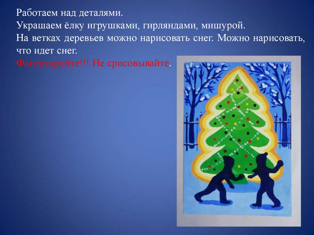 изображать теплыми красками, а что холодными. Ёлка будет сверкать