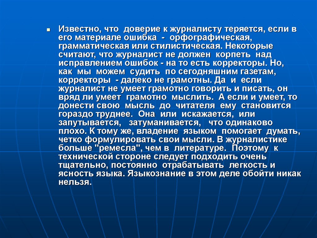 Известно, что доверие к журналисту теряется, если вего материале ошибка - орфографическая,