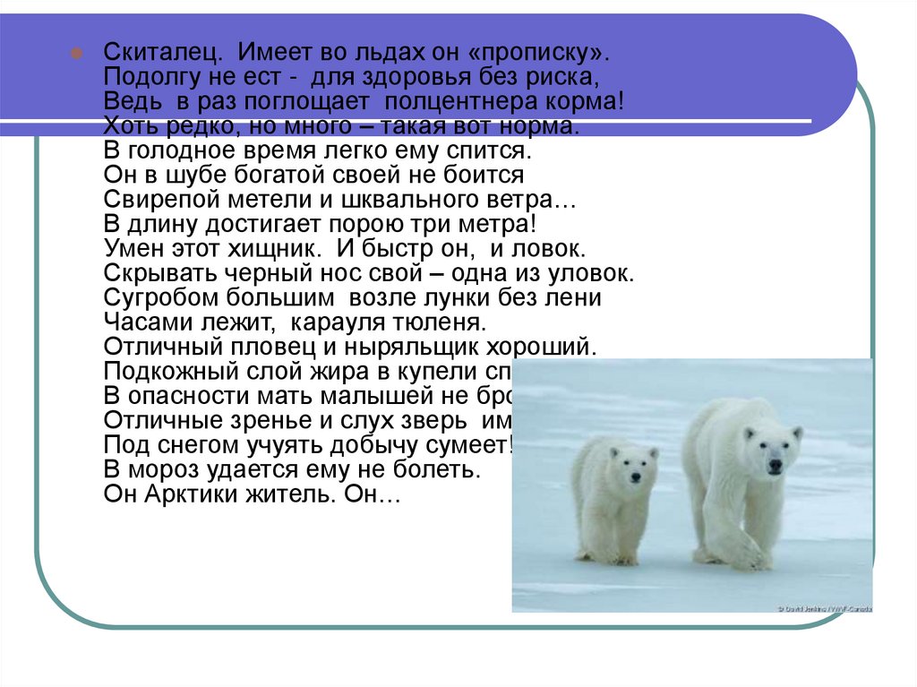Скиталец. Имеет во льдах он «прописку».Подолгу не ест - для здоровья без риска,