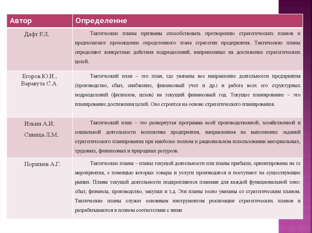 Тактический план – это развернутая программа всей производственной, хозяйственной и