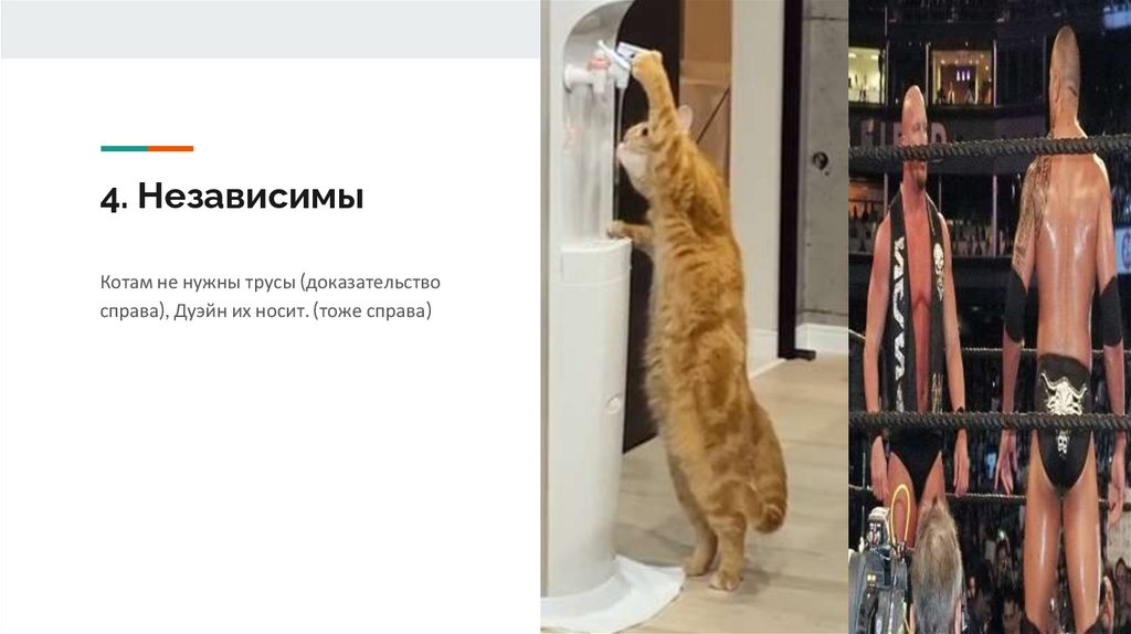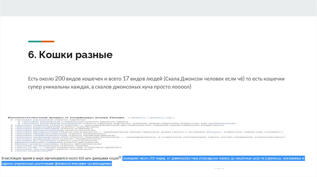 6. Кошки разныеЕсть около 200 видов кошечек и всего 17 видов людей (Скала Джонсон человек если чё) то есть кошечки