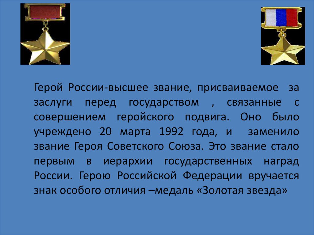 Герой России-высшее звание, присваиваемое зазаслуги перед государством , связанные с