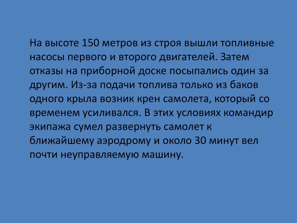 На высоте 150 метров из строя вышли топливныенасосы первого и второго двигателей. Затем