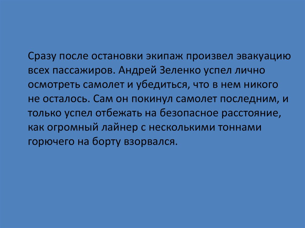 Сразу после остановки экипаж произвел эвакуациювсех пассажиров. Андрей Зеленко успел лично